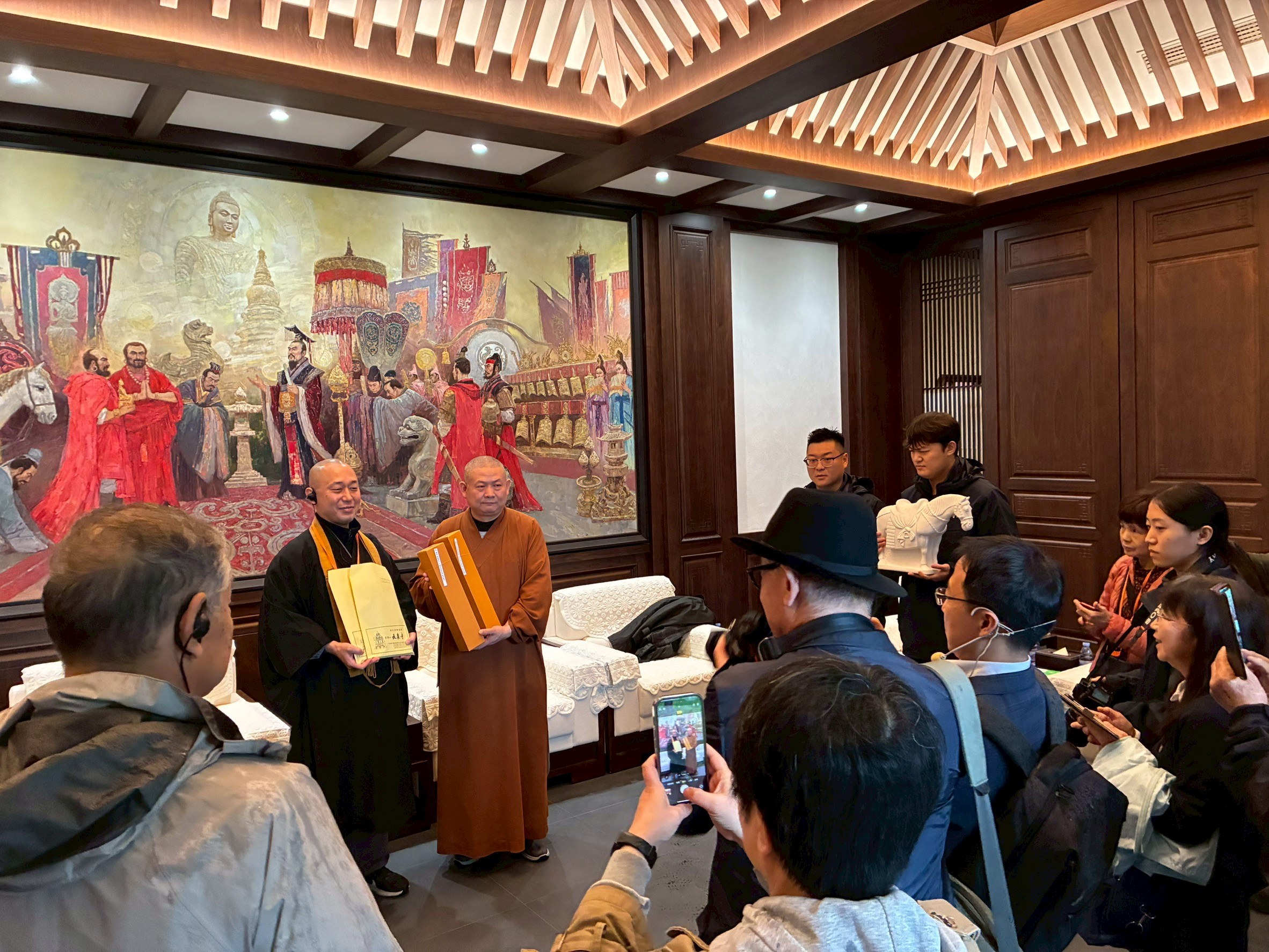 今般、岡山より同寺を参拝した我々一行は、弘法大師の著書をまとめた『十巻章』と、毛筆では日本で最高級と呼ばれる「熊野筆」をお土産として奉納し、白馬寺様からは陶器の白馬像と、同寺に伝わる『仏説四十二章経』の拓本を頂戴しました。歓迎レセプションの後は、同寺本堂をはじめ大変広い境内をご案内いただき、さらには精進料理のおもてなしをいただくなど、素晴らしい交流の時間を過ごさせていただきました。ありがとうございました。
