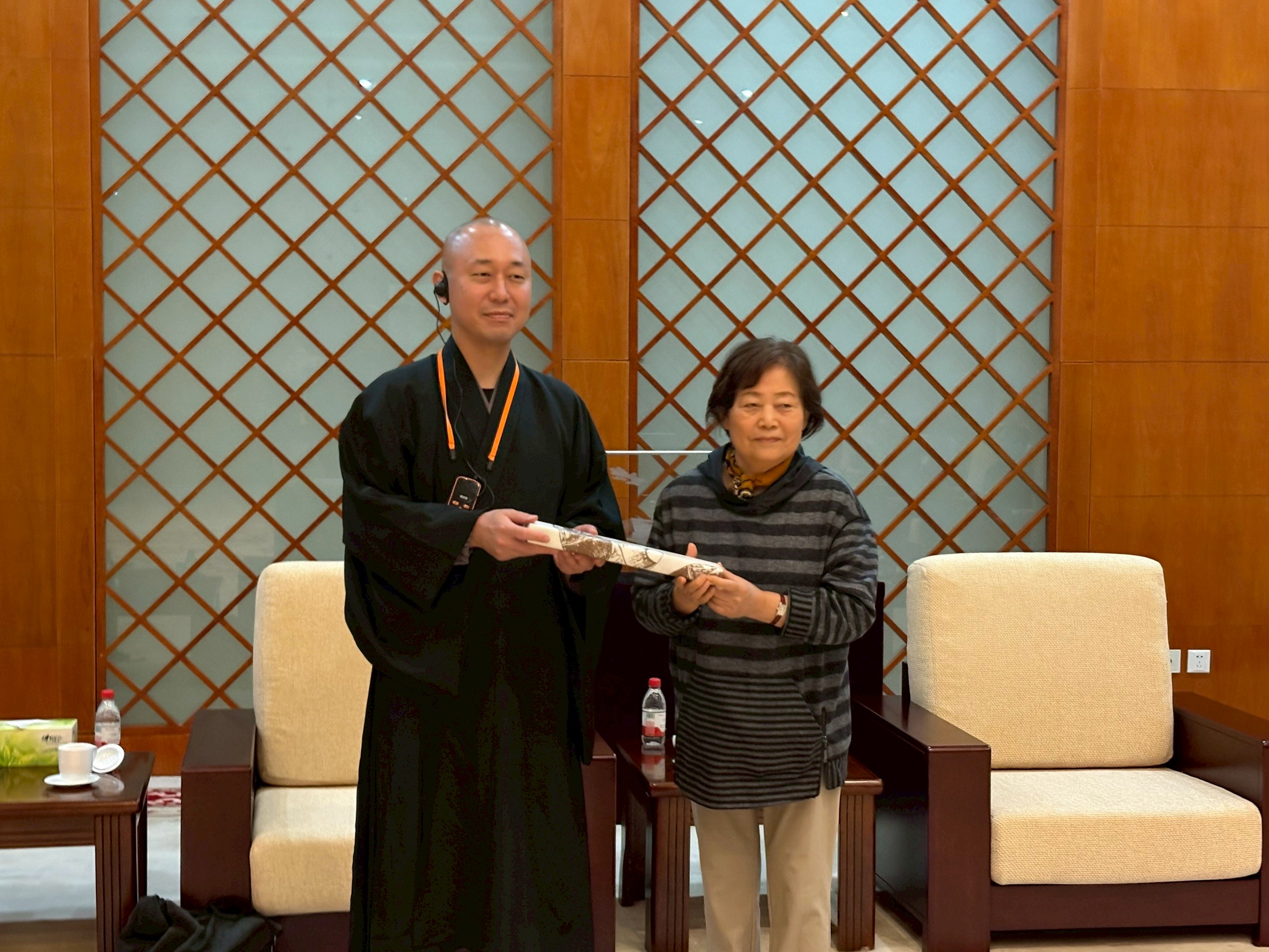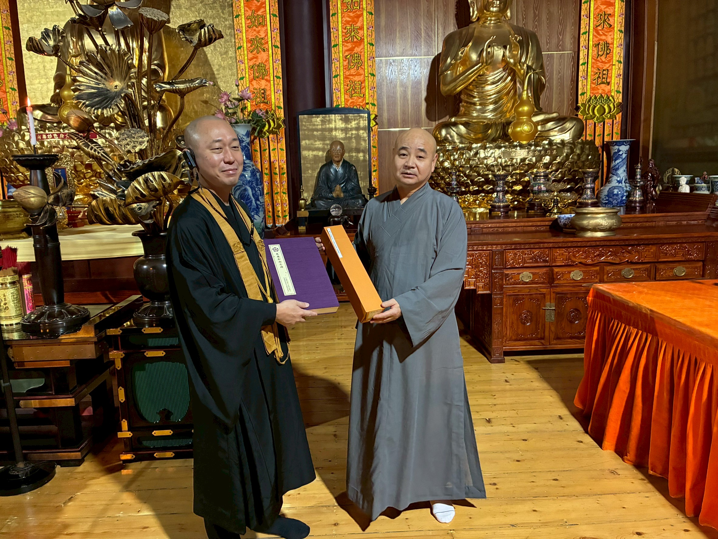 岡山市の友好都市である洛陽市には、「白馬寺」という中国最古のお寺があります。岡山、洛陽両市の民間交流事業の中で、当山は40年以上にわたって同寺と仏教文化交流を重ねてきており、当山鐘楼門の梵鐘や玉仏堂に祀られる釈迦牟尼佛像はこれまでの交流事業の中で白馬寺様より請来されたものです。また、同寺現住職である印樂方丈様には平成31年に奉修した「本堂修繕落慶法会」にご参列を賜り、さらには令和4年の玉佛堂落慶法会に対してはコロナ禍ということもありビデオレターを頂戴しました。当山からも先代の光研名誉住職がこれまで毎年のように訪中し、白馬寺先代の海法方丈様の代より友好交流を続けるなど、仏教を通じた文化交流を深めてまいりました。